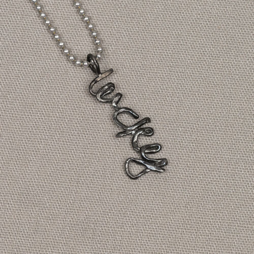 Pendant made of 925 sterling silver and oxidized silver. The letters LUCKY are handwritten which creates a traditional effect. Happiness (or fortunately) can be defined as being satisfied with the current living conditions. Are you LUCKY today?