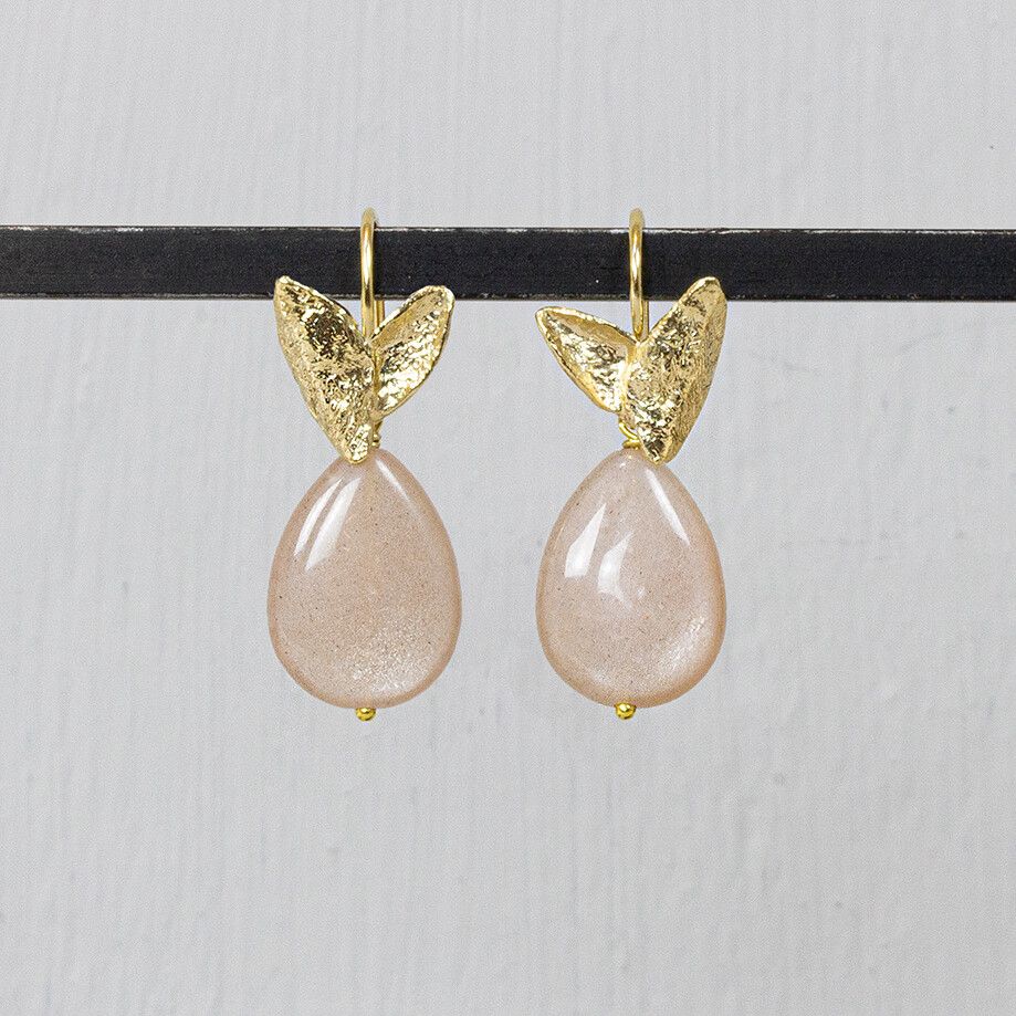 Earring by Jéh Jewels made of oxidized shiny silver and Pink Moonstone. The Pink Moonstone ranges in color from salmon pink to orangey pink. As the name suggests, the stone is in strong contact with the moon. The stone has a positive effect on intuition and fertility. In addition, it has a calming effect on the emotional life.