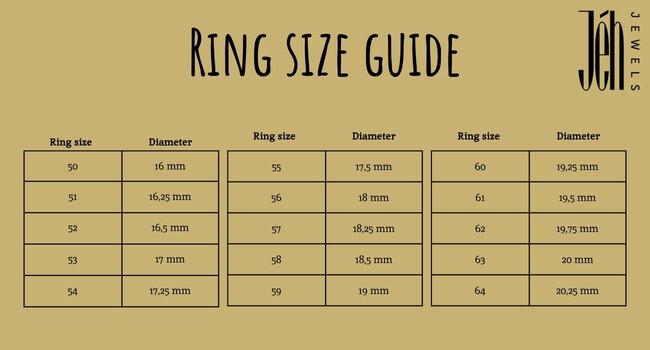 De ringen van Jéh Jewels zijn verkrijgbaar in de volgende ‘even en oneven’ maten: maat 50 t/m 64. Ringen groter dan maat 60 hebben 10% meerprijs, dit vanwege het gewicht aan zilver in de ring. Ringen zijn niet kleiner dan maat 50 en niet groter dan maat 64 verkrijgbaar.