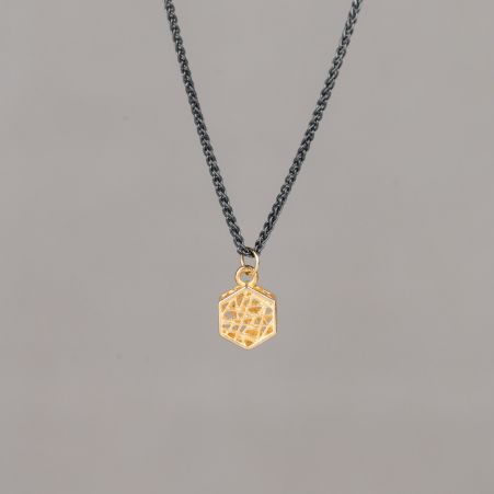 Op voorraadCollier gemaakt van 925 geoxideerd sterling zilver met daaraan een 3D hexagon hanger van 14 karaat goud.