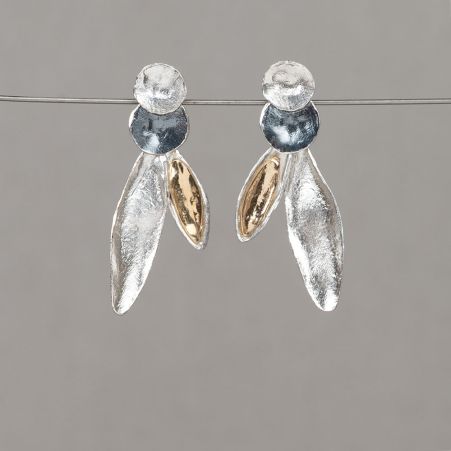 Deze elegante oorbellen combineren verschillende vormen en materialen in een speels ontwerp. Gemaakt van 925 sterling zilver, geoxideerd zilver en verguld zilver en organische elementen wat zorgt voor een verfijnde en tijdloze uitstraling.